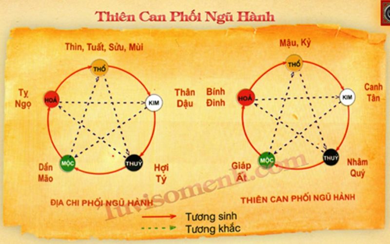 • Ngũ hành tương sinh: Kim sinh Thủy, Thủy sinh Mộc, Mộc sinh Hỏa, Hỏa sinh Thổ, Thổ sinh Kim.